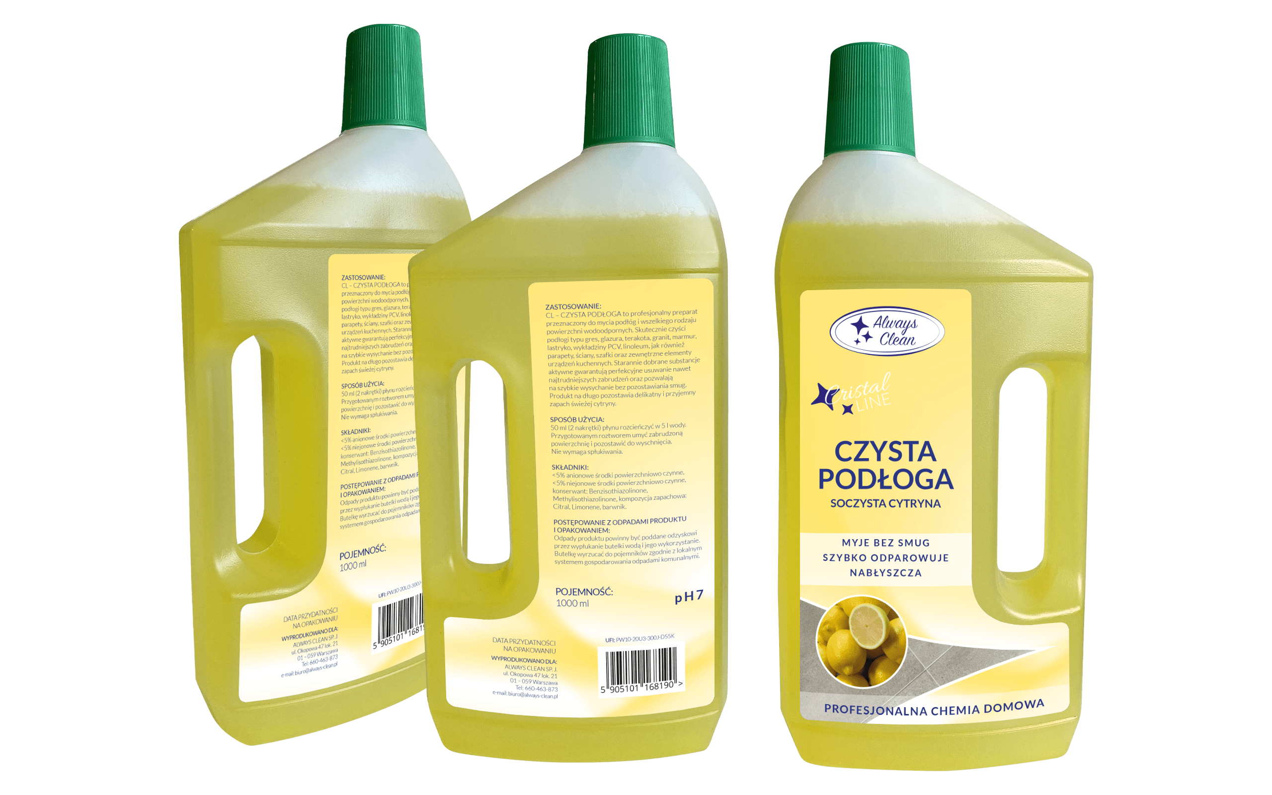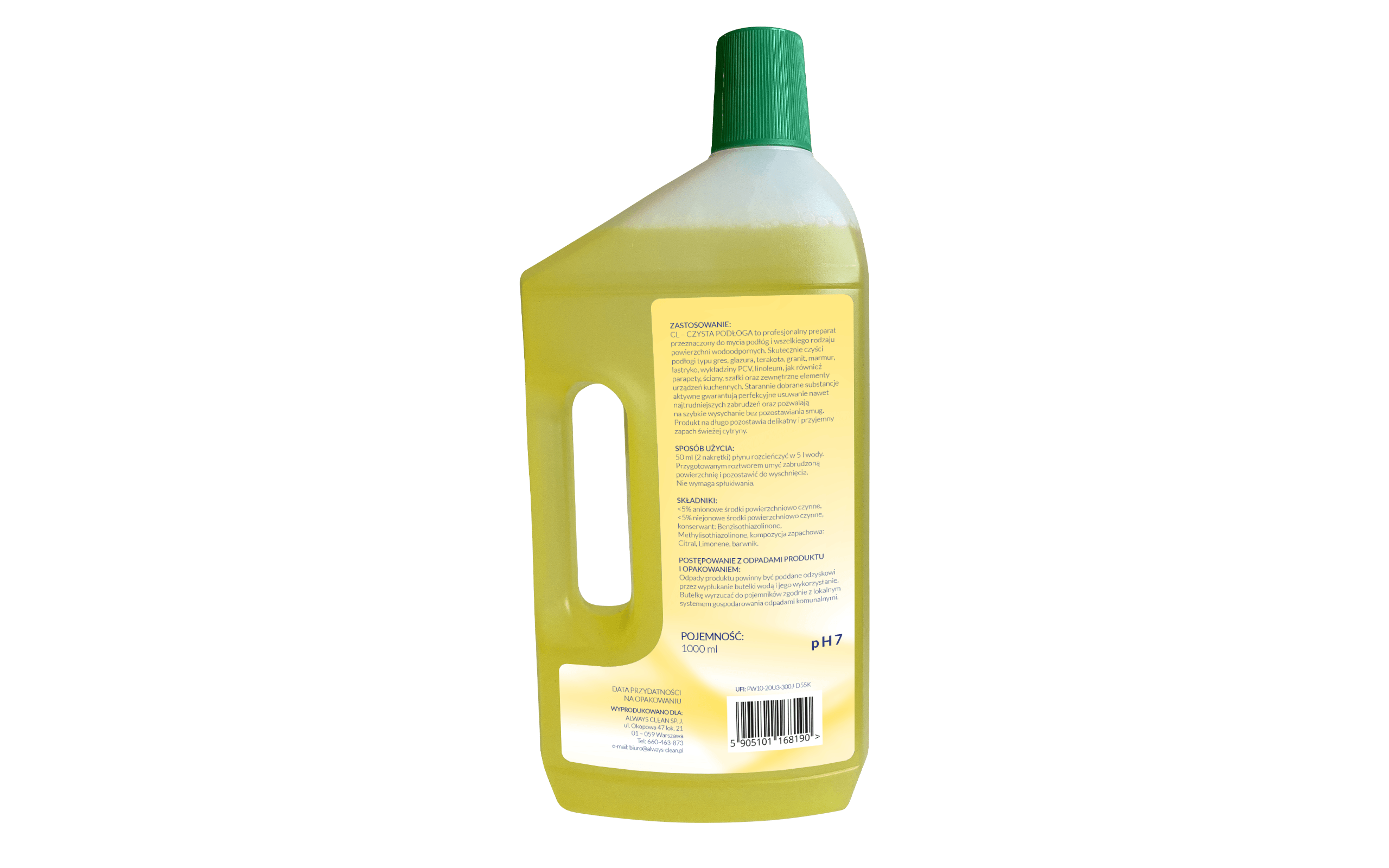 CL – CZYSTA PODŁOGA (SOCZYSTA CYTRYNA) to profesjonalny preparat przeznaczony do mycia podłóg i wszelkiego rodzaju powierzchni wodoodpornych. Skutecznie czyści podłogi typu gres, glazura, terakota, granit, marmur, lastryko, wykładziny PCV, linoleum jak również parapety, ściany, szafki oraz zewnętrzne elementy urządzeń kuchennych. Starannie dobrane substancje aktywne gwarantują perfekcyjne usuwanie nawet najtrudniejszych zabrudzeń oraz pozwalają na szybkie wysychanie bez pozostawiania smug.
