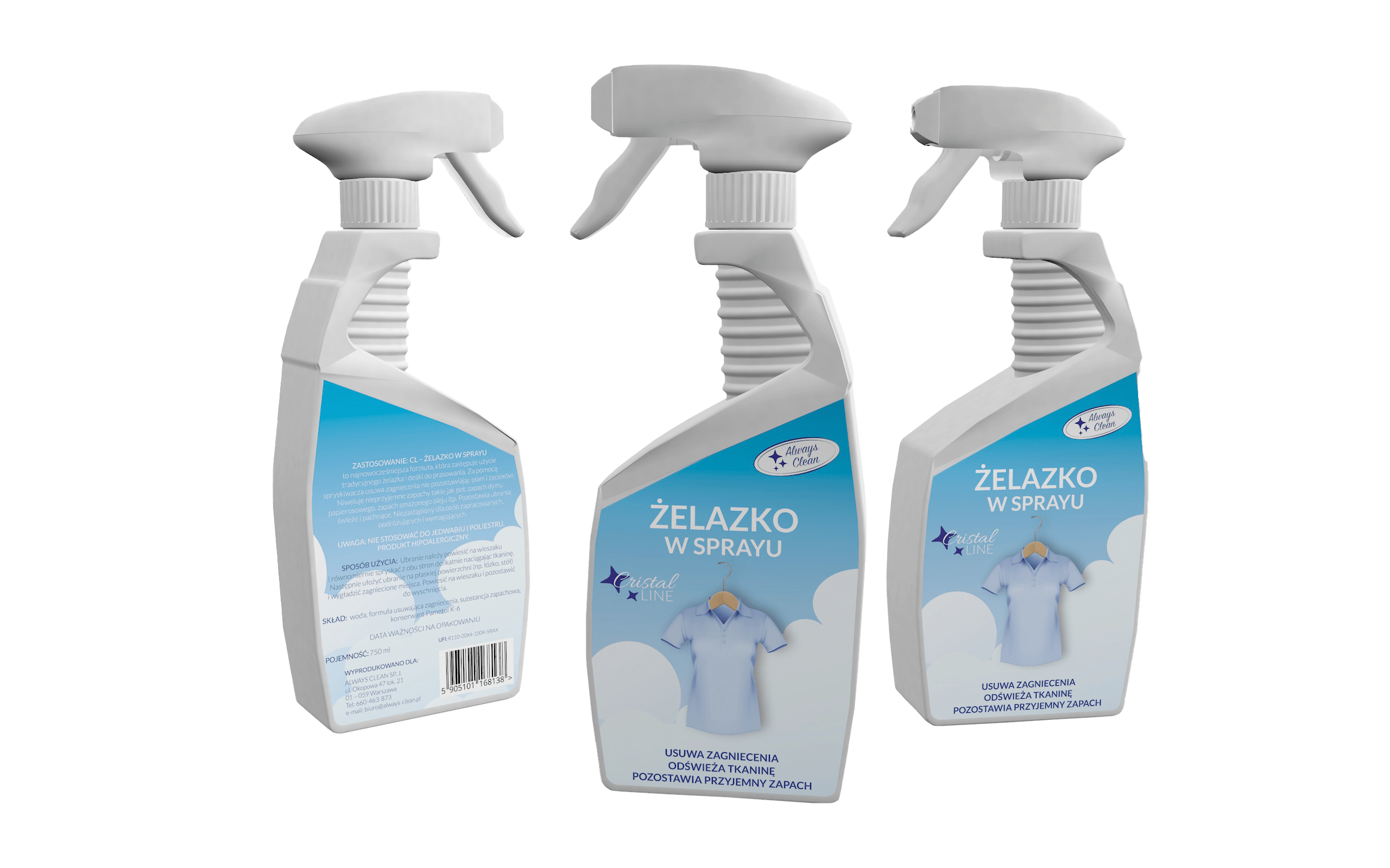 CL – ŻELAZKO W SPRAYU to najnowocześniejsza formuła, która zastępuje użycie tradycyjnego żelazka i deski do prasowania. Za pomocą spryskiwacza usuwa zagniecenia nie pozostawiając plam i zacieków. Niweluje nieprzyjemne zapachy takie jak pot, zapach dymu papierosowego, zapach smażonego oleju itp. Pozostawia ubrania świeże i pachnące. Niezastąpiony dla osób zapracowanych, podróżujących i wymagających